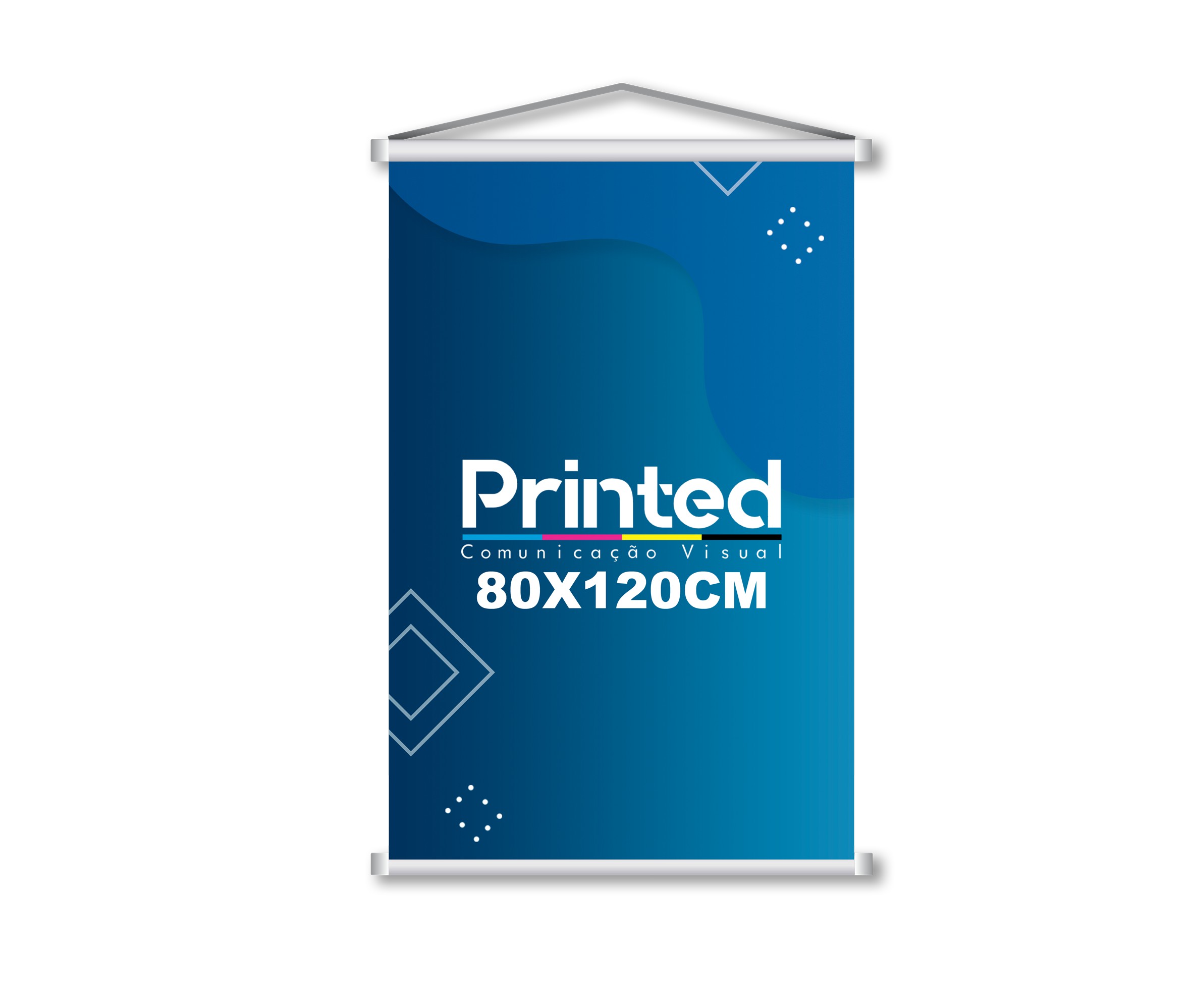 Acabamento padrão com bastão, ponteira e cordão para pendurar, a largura máxima para banner é de até 2 metros, maior que 2 metros, recomendamos lona com reforço e ilhós.
